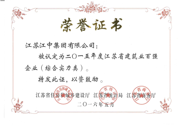 2016年6月13日,江苏省住房城乡建设厅、省统计局、省商务厅在南京联合召开江苏建筑业“走出去”暨百强企业发布会。江中集团荣获2015年度“建筑业百强企业”(综合实力类)。副省长张雷出席会议并讲话,省住房城乡建设厅厅长周岚出席会议,厅党组书记、副厅长顾小平作工作部署。集团党委书记沈岳应邀参加会议。