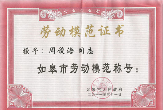 2011年4月28日,如皋市劳模表彰大会暨工会工作会议在市民中心三楼报告厅隆重召开,集团苏州分公司总经理周俊海同志荣获如皋市劳动模范称号。