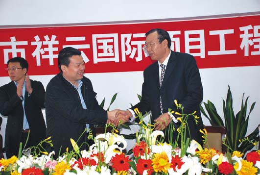 2010年4月3日上午,江中集团承接的祥云国际项目在石家庄市举行施工签约仪式。集团有限公司副董事长、河北分公司总经理石太林与联邦伟业房地产集团总经理高会臣分别在合作文本上签字,并代表所有施工单位作了表态发言。