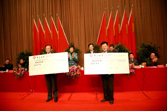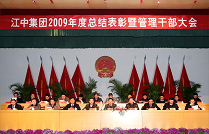 2009年2月18日上午,江中集团2009年度总结表彰暨管理干部大会在培训中心大礼堂隆重召开,表彰奖励为企业发展作出突出贡献的先进集体和劳动模范,动员全体干部和职工学赶先进,同心协力,真抓实干,奋勇争先,确保集团持续、快速、和谐向前发展。如皋市委常委、副市长马建明,市建工局局长冯昕,吴窑镇党委书记、镇长赵宏祥应邀出席大会,并在主席台就座。集团领导班子成员,总公司部室全体人员,各下属公司全体班组长以上管理人员和职工代表1000多人出席会议。