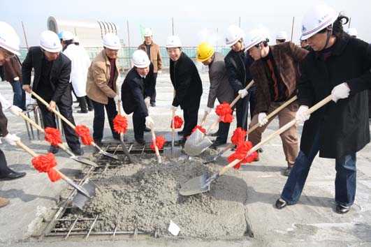 2010年4月8日,我集团承建的徐州医学院附院病房综合楼主体顺利封顶,徐州分公司总经理沈忠星和当地相关部门的领导参加了封顶仪式。