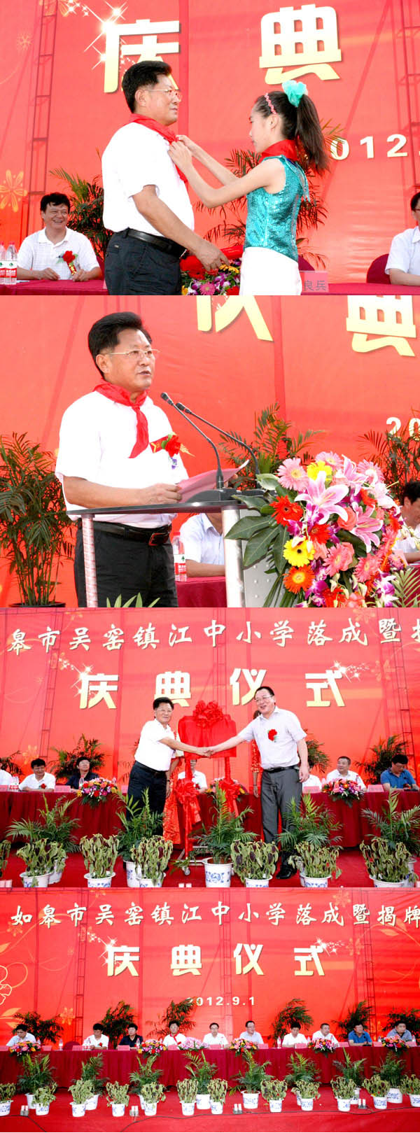 2012年9月1日下午,如皋市吴窑镇江中小学举行落成暨揭牌仪式,庆祝学校落成启用。市人大常委会副主任张元健、副市长缪爱诚、吴窑镇党委书记赵宏祥、集团董事局主席沈良兵等领导出席揭牌仪式。