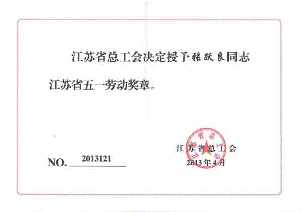 2013年4月26日,江苏省召开庆祝“五一”国际劳动节表彰大会,我集团党委副书记、山东分公司总经理张跃良被评为江苏省“五一劳动奖章”获得者。