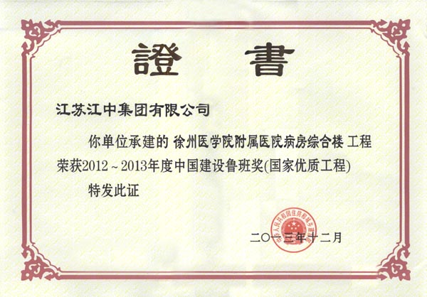 2013年12月5日,中国建筑业协会在北京隆重召开2012~2013年度中国建设工程鲁班奖(国家优质工程)表彰大会,我集团总承包施工的徐州医学院附属医院病房综合楼荣获建设工程鲁班奖,集团董事局主席、党委书记沈良兵应邀出席颁奖仪式,并上台领奖。
