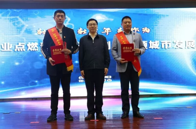 ▲市委常委、市委组织部部长、统战部部长缪爱诚为沈锋总裁颁奖