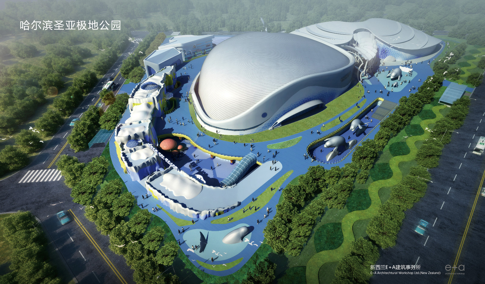 极地公园项目聘请了国际顶尖设计团队,由新西兰e a进行项目规划设计,将一期建筑与二期建筑有机结合成栩栩如生的“大白鲸”造型,与哈尔滨大剧院形成两大特色地标,动静结合,相互呼应;由美国著名魔幻大师弗朗兹·哈拉利(世界魔术史上第一位集设计、制作和表演于一身的魔幻大师)进行奇幻秀设计;由日本综合环境设计专家宫岛修二先生进行景观设计。