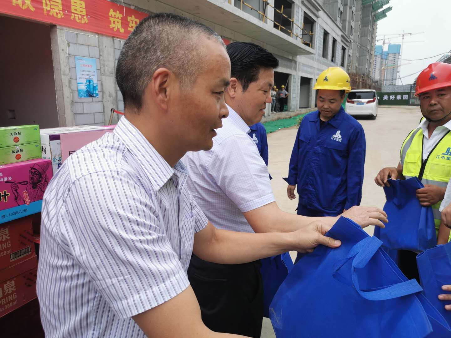 近日,如皋市政协副主席严世斌、市总工会副主席陈光荣、市总工会组织部部长沙建中、集团公司党委书记、工会主席沈岳在集团副总裁、二公司总经理沈忠国等陪同下来到忻州锦绣学府工地进行高温慰问。严主席一行看望了一线施工工人,向他们发放了清凉慰问品,嘱咐大家在紧张工作的同时,要做好夏季防暑降温和安全生产工作,创精品工程、用户满意工程。